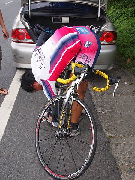 胎壓不足,我們又沒有打氣筒,不過沒關係一定會有人帶,去借就好了。借我打氣筒的大哥很好玩,打完後問我是哪一組的,答曰:RM35。不同組還好,不然要把氣漏回來XD。