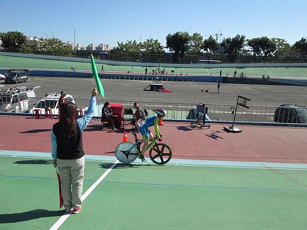 場上正在進行的是女子菁英組三公里個人追逐的項目。別小看這個只有333公尺的跑道,2012年奧運中自由車共有18面金牌,其中就有10面金牌的項目是在自行車場上產生,不過我們的333公尺的跑道已經是不符合世界潮流的跑道,現在主流的場地都是250公尺的跑道。仔細看可以看到對面支撐擋土牆的鐵柱,這個可謂世界奇觀了。