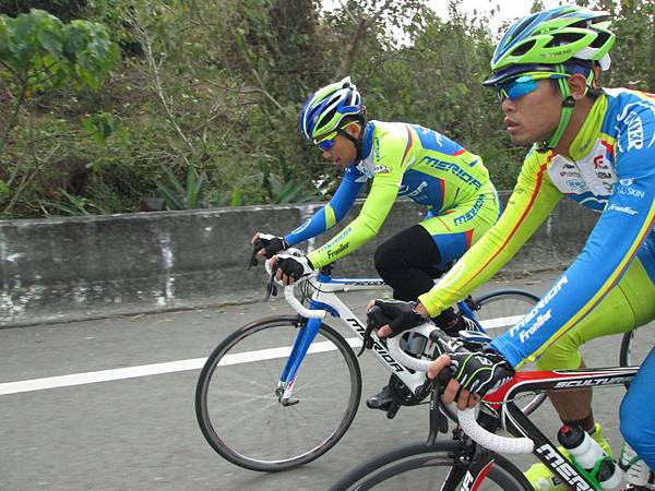 回程雖然先跑,但是還沒到縣界就被追上,爬密枝雖然慢,但還是跟上隊伍。到北寮第一個坡就開掉拉車跟上隊伍,在南天門坡被拉距離,下坡跟車再接回去。旗山到嶺口段恩杰帶的很快,這段均速為37kph,在跑了150公里後即使躲在隊伍之中還是感到很吃力,更別說從北寮之後大小腿不時的抽筋感。爬嶺口坡撐到加油站就開掉,又拉車跟上,到轉彎的陡坡段還是自己爬,爬沒幾下就爆掉...,目送其它人離去。反正都到嶺口了,自己慢慢"蛇"回去就好...。