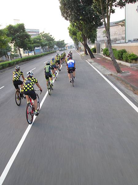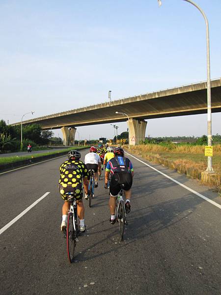 咦!?人數變少了。都是阿修說要做課程,和一位紅點衫的車友說明了後,就超越隊伍開強度,隊伍還是很整齊的前進,但是在萬丹交流道時被紅綠燈擋住,綠燈後我就起步加速開始領騎,準備帶領阿修前進。其實我有個習慣,不知是好是壞,我領騎時大部份時間我都不會回頭看,而是低頭看後方的車輪有沒有跟上,結果一路領騎快到潮州時,退下來才發現阿修沒有跟上來,跟上來的只有六七位左右。好吧~那就這樣子繼續前進吧。