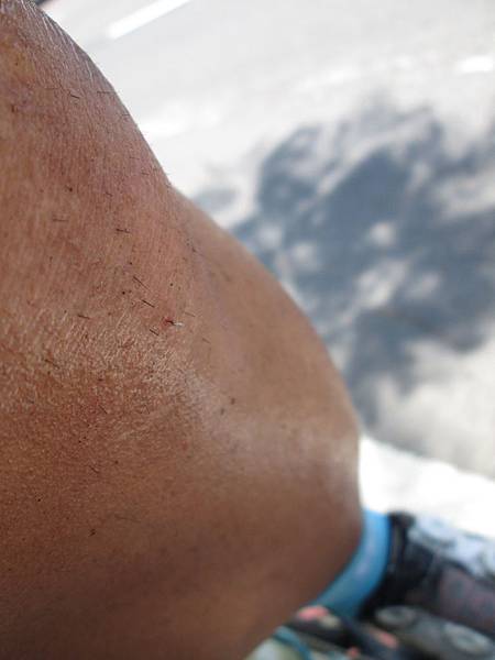 在快到海口時,被不明物打中,左小腿一陣麻麻感,原本不想理會,但是有點痛呀,停車一看發現一根小小刺,看來我被蜜蜂撞到了,不過蜜蜂把刺留在我的腿上,代表這蜜蜂選擇與我同歸於盡了。後來的路上,我不斷的想我會不會被蜜蜂叮到後變成青蜂俠之類的XD。