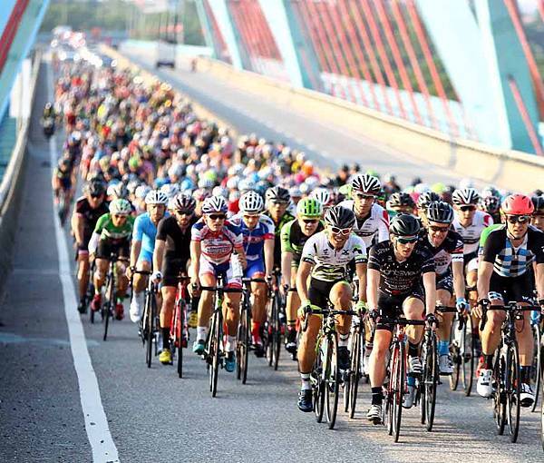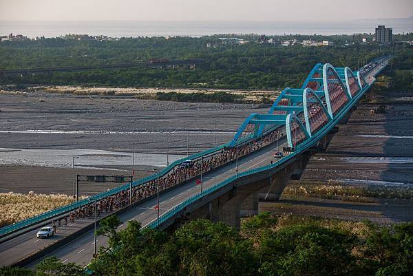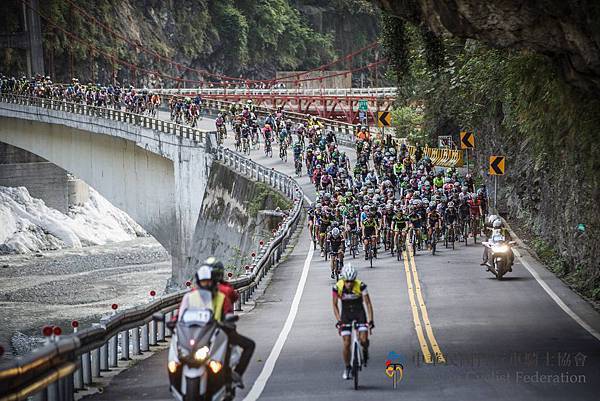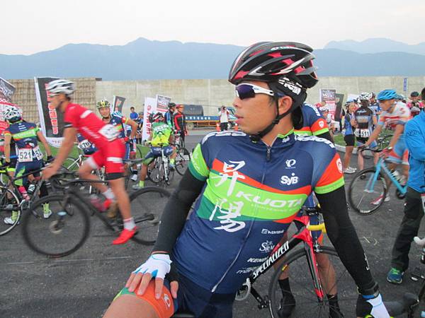 眾家大咖車手都在這裡了。在太魯閣大橋的末端是個緩上坡的地形,我在這邊就有點守不住自己的位置了,開始往後。沒錯,還沒到開賽的計時點,我就準備向後單飛了。雖然向後單飛是意料中之事,但是我沒有想說這麼快就發生。