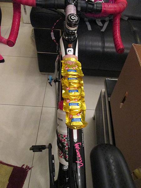 好吧,我也沒有資格笑人。我身後車衣口袋左邊裝了手機、全指手套和長袖的風衣。中間裝了十包的諾壯GEL。右邊則是塞了大會的果凍能量包、穀物棒、還有ERIC借我的防風背心及相機。