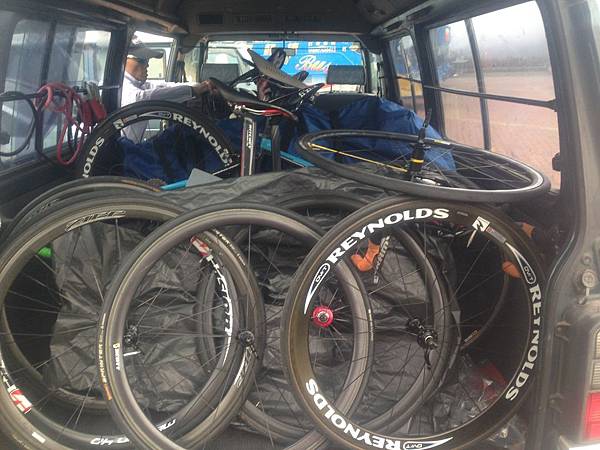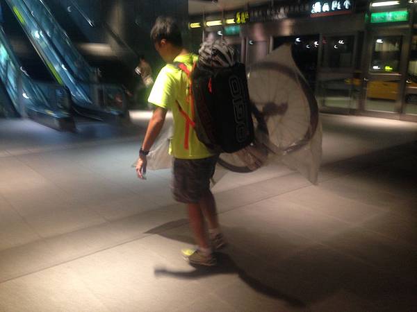 此行最悲壯的ERIC才發現他的攜車袋完全不知道在何時消失了...。最後在服務櫃台取得三個超大半透明垃圾袋,在有包和沒包差不多的狀況之下上高鐵了(好孩子不要學哦!)。ERIC真的很悲壯啊,到花蓮才胃痛去掛急診,忍痛不出賽。輪組拆借耕宇,風衣借我。結果現在要上車才又攜車袋不見,這趟花蓮遊,花的還真不少。時間也花了,錢也花了,但是只能坐在車上看別人努力。