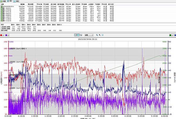 這是我很弱的記錄圖,可以明顯的發現我的迴轉速越降越多,在第六段碧綠到關原,降到只有62rpm。雖然這段有本次最長的下坡,但是迴轉速的整體下降還是個不爭的事實。另外,就是太過於有氧了,騎的太過於輕鬆了。不過話說回來,也許再更用力輸出,說不定下一個站在路旁抽筋的人就是我,這部份的拿捏真的很不容易啊。