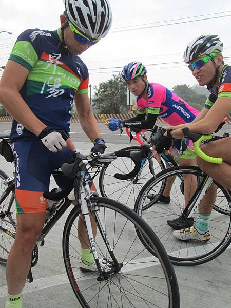 和阿福先在全國電子會合後就往集合點去,平時去的鳳山厝元氣人正多就在深水買早餐,很古早味的漢堡,還順便去深水派出所裝水,早上出門時間太趕沒裝到水。參加團練的人有阿福、ERIC、郭小彬,而依例阿修一定都遲到的,不過現在狀況有改善一點點,大約只比之前早來五分鐘吧。快看呀,阿修除了鎖氣嘴蓋外、裝前煞車又多了一項新技能,鎖上蓋!