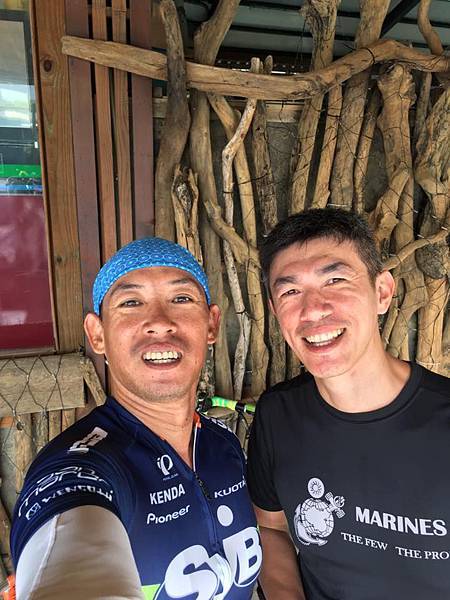 風向東北,所以我們往南騎是順風,但是相對的速度拉不起來,也只有大約三十出頭,到了品味軒補水及食物,這時九點一刻,但是太陽不小了。小毅覺得體能狀況不佳,於是就提議回程,這我舉雙手雙腳贊成,就在這時候有人叫我,回頭一看是諶之啊。沒想到隨便都遇到認識的人。