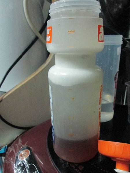 其實還好,我只是懶的帶一堆在背後,所以一口氣加三包,在路上時再小口小口喝,到補給點時再加滿稀釋,後來濃度就會下降了,就可以照正常量喝。這瓶就是我的特調,下方是滿滿的大平台蜂蜜,中間白色的BCAA部份看起來很多,其實中間還有丟梅子下去增加口感,有時有買檸檬時也會加進去。你問這口感很怪嗎?嗯~就甜甜鹹鹹的,沒喝過的人應該會覺得很怪吧,喝習慣了就還好,有熱量有鹽份也有各種維生素補充及大量的BCAA。