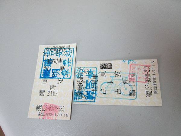 自行車要收半價的票,車票上還蓋有自行車的圖案。坐的當然是電聯車,每一站都停1418出發,1800才到花蓮,這速度是比騎自行車快上很多,不過還有等待的時間,其實讓我還是想了一下要不要坐車。考慮過後還是坐吧...