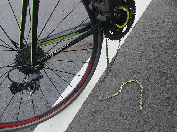 實踐坡有跟完,但是坡頂被拉開距離,在內門拉回到隊伍之中,上龍崎坡時死命的跟著小駱的節奏前進,原本想追擊前方的智隆和阿福,但是才到一半就無力,只能用自己的速度前進了。上到坡頂人都不見了,原本想追擊的,沒想到一個換擋後,我的鏈條又斷了,正確的來說應該是快扣剛好解開了...。路旁等車的阿姨還很好心的幫我找到一片快扣,但是另一片就找不到了。不過沒關係,這事我很有經驗了,所以我身上有備用的快扣,快速的裝完快扣後就繼續出發。