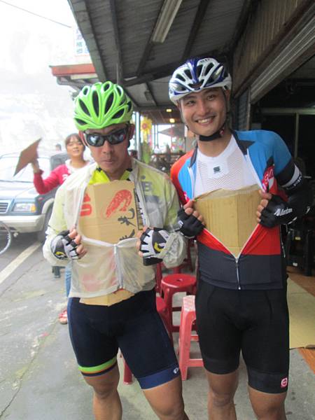 好不容易才把貓貓請下背,就換我們要下山了,向店家要了紙板充做擋風的背心。圖中店家女主人還很熱心的拿紙板問其它人是否有需要。