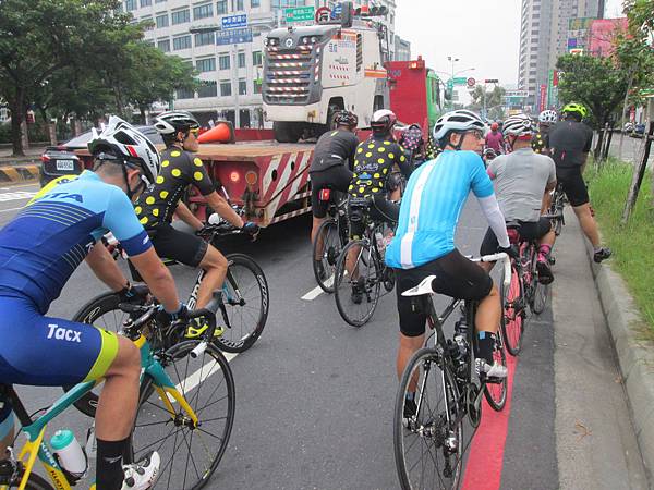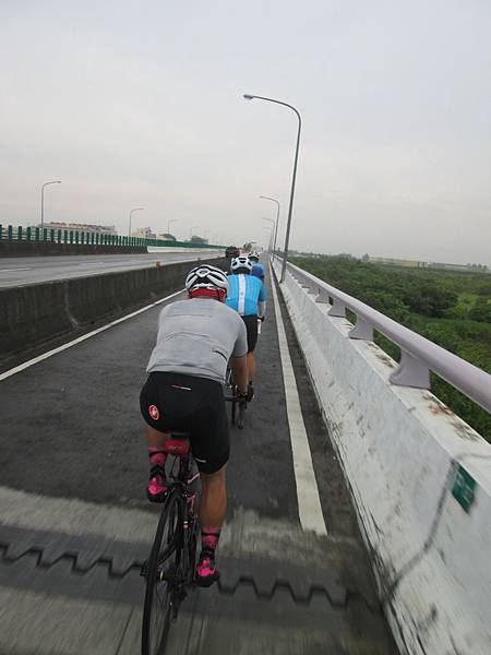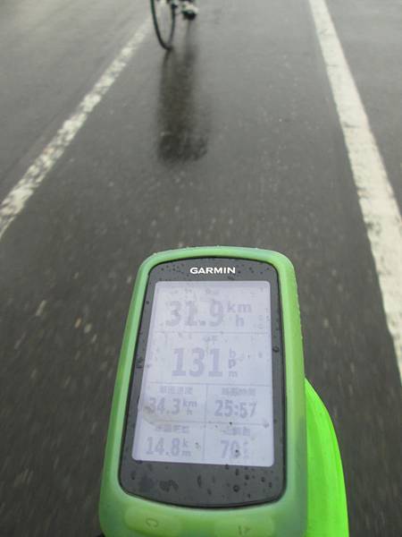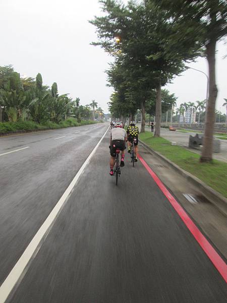 回程是吹北風,速度不慢,但是也下起了小小雨,雨不大,但是足夠把身上及地上都打溼。這又讓我回想到花東了,今年回想到花東的時侯比起往年多很多...。回程續航力明顯不足,因為練習不足的關係,強度目前大約只有兩個小時左右,而且超過後就衰竭的很快。過了黃金海岸老榮民落隊,不過他說不用理他。淩大大詢問了跟車的技巧及手勢和注意事項,原來我習以為常的事,還是很多人不知道。讓我回想到以前帶團練的時光(遠目)。