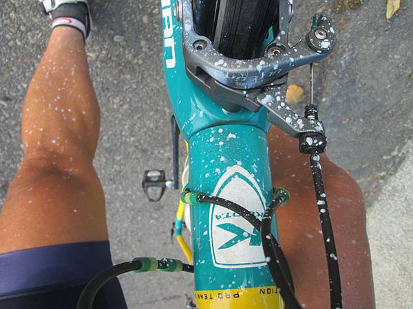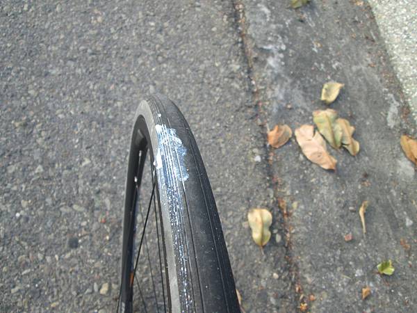 0721到台南0722開始回程,回程才過黃金海岸就感覺怪怪的,好像有什麼東西在前輪,原本不在意,不過那個東西越來越大,只好停下來看一下,不停還好,一停下來才發現我的車被噴的亂七八糟了,原來那個會慢慢變大的是補胎劑的凝固塊。