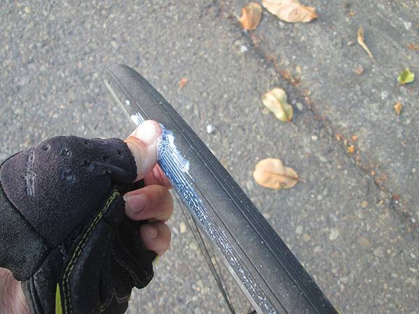 看著補胎劑形成的白色噴泉不斷的噴發,只好先看看異物還有沒有在上面,沒有發現異物存在,那就按壓一下噴發處,給他時間去凝固。若是洞沒很大的話它會自動補起來,洞大一點,按壓一下它也會補起來。要是洞大到補不起來,那就換條內胎上去了。還好這洞不大,按壓一下後就補起來了。