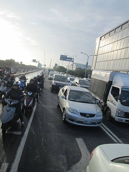 小駱原訂計劃是每人領騎三分鐘後換人,然後我輪了兩次後,小駱說:「小楊哥你要不要保留點體力,回程時再加入好了。」(樂)。不對吧~!這是代表實力落差到無法參與輪車吧(翻桌)(這是事實)。所以我就默默的跟在他們兩人的後方。0706進台南,在行經台南市時照例早上都會灑水,一路灑到科學園區,早上七點多上班的車潮真的人很多。