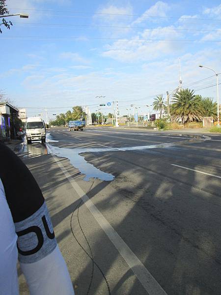 風這麼大,而且加上心理狀況沒有很好,所以就一路頂著風前進著。心想那時和阿修兩百瓦只有速度不到二十是什麼情形?去程整整花了74分鐘才到。回程時回到茄萣興達港時,看到灑水車感覺不妙,不過灑水車只灑了這麼一點就沒水了,要收工回去再去加水了。