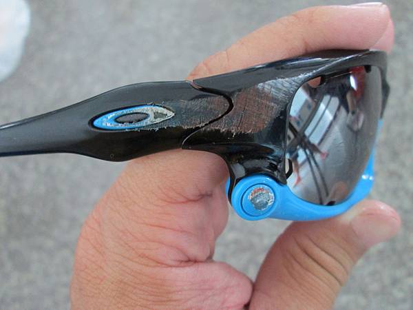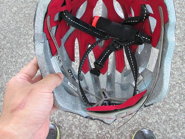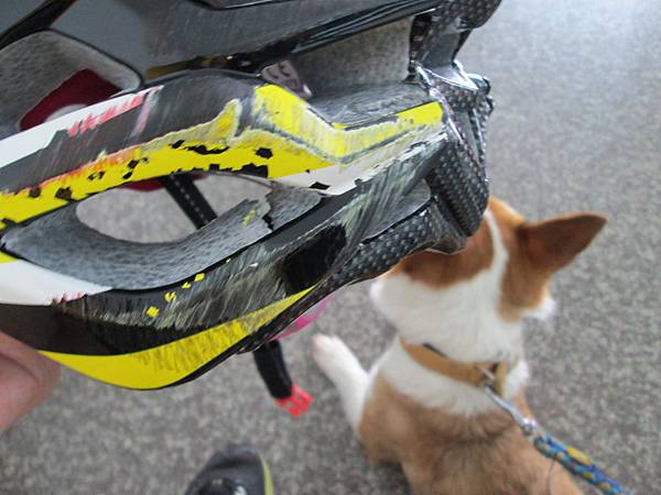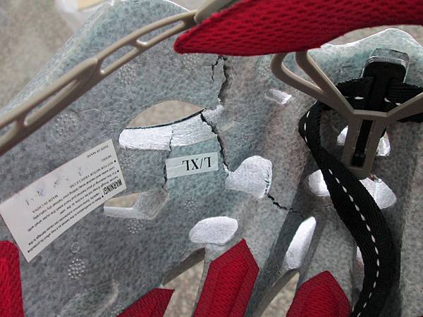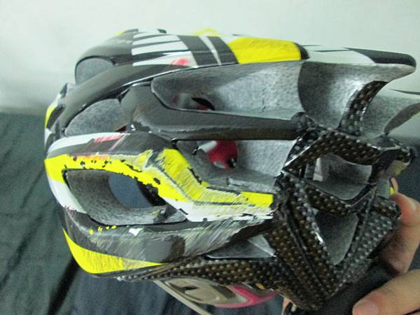 安全帽左後方推測為第一撞擊點(破損最重) 右前方撞擊後滑行