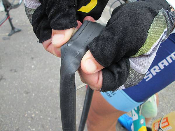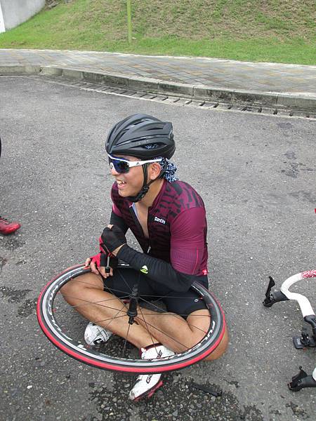 打完氣後,準備出發了,但是忠駿看氣嘴歪歪的,所以想扳正氣嘴。然後...氣嘴就硬生生的被折斷了!就留下狂笑到打滾的大伙和呆滯看著被扳斷的氣嘴忠駿...。大大手力好驚人的呀!