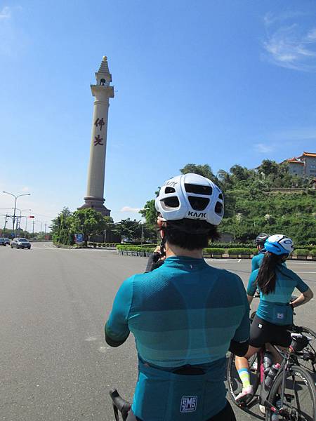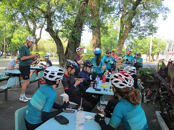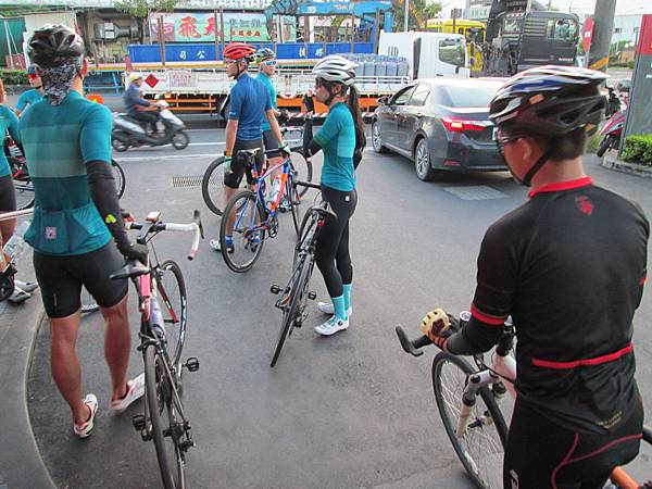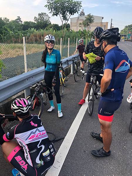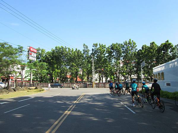 出了旗山往杉林的方向前進著,不過有位穿迷彩車衣的車友漸漸落隊,怕他一路往甲仙前就幫忙他領騎帶路。過了月光山到了美濃後,隊長岱育和另一位車友在轉彎的廣場等待我們一起往旗山糖場前進。