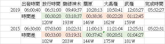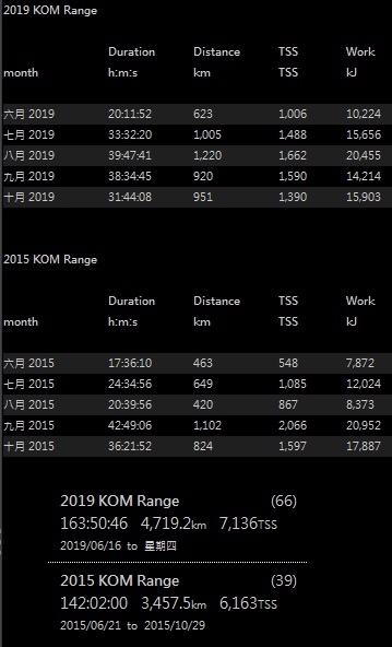 回到家,拉了2015年及2019年的資料出來比對,看起來貌似2019年的騎乘時數和距離在同一段時間相比(20190616-20190624、20150621-20151029),2019的練習量都比2015年多,但是時間卻比2015年相較慢了十分鐘,而且在關原後就一直有抽筋感,大禹嶺無法抽車只能蛇形,這種種的現象讓我疑惑著。