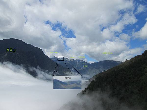0950過碧綠,照樣停下來補水,吃Gel上路,過了碧綠就大約還有二個小時就到了。不用擔心手機電量不足,拿出藍芽耳機(單邊)開始聽音樂,同時也把Garmin的Live Track打開。其實只是打發時間,分散一下注意力。直到遇到這難得的大景出現,看到對面的山頭了嗎?左邊大山是屏風山,最右邊是合歡山北峰,而右邊中間小凹下去的是等下會要爬的合歡坡,坡的左側兩邊白白的是石門山和石門北峰...。怎麼還這麼遠啊...。