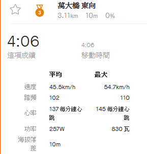出門前被告知要吃飯,1730前要回來,所以在1419出門的我一點能耽誤的時間都沒有。1444站上萬大橋起跑線,原本以為可以在四分鐘內跑完,但是很殘念的最後六百公尺力竭,只能維持速度不要掉太多,但是也無法再加速了,雖然如此均速還是拉上了45Kph,我知道自己的能耐,會這麼快都是順風的關係。竟然是生涯第三快。