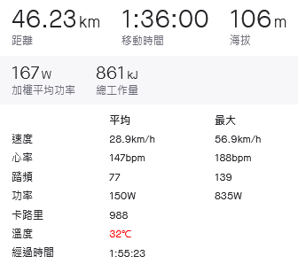 只騎了46公里就收工,當然沒什麼練到,不過因為心跳改用手錶心跳後,心跳算是正常了點(?),數據都會比較正常的在15X 16X的跑,有時還是會和體感不太搭,但是算是正常許多。不會像用心跳帶騎到要死都是一百出頭的心跳,真的那麼強就好囉...。趁著還沒下雨回到家,完美。