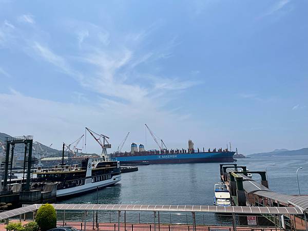 其實走到旁邊會看到Maersk(快桅)的超大貨櫃船,只是不知是多少TEU就是了。左側就是可以坐往廣島港或是遊吳港的搭船處,只是今天並沒有這樣的規劃。