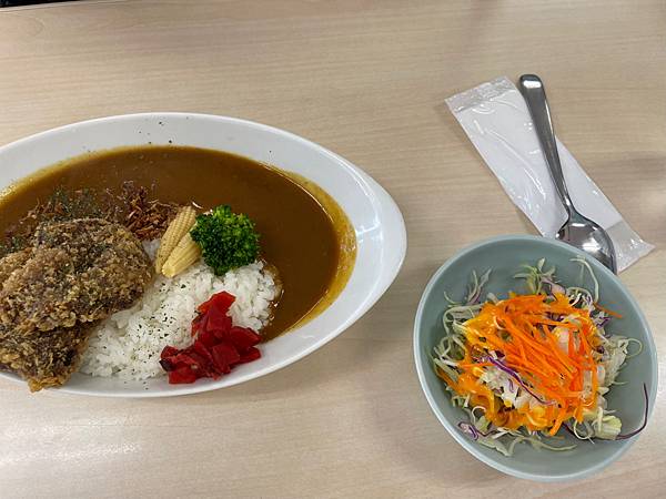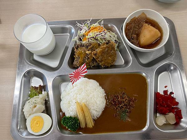 入座後點了經典的海軍咖哩飯,用著不鏽鋼的自助餐彷彿又回到當兵的年代。這餐點比我服役時吃的好多了,而且不用洗盤子(逃)。右下角紅色的漬菜還不錯下飯。